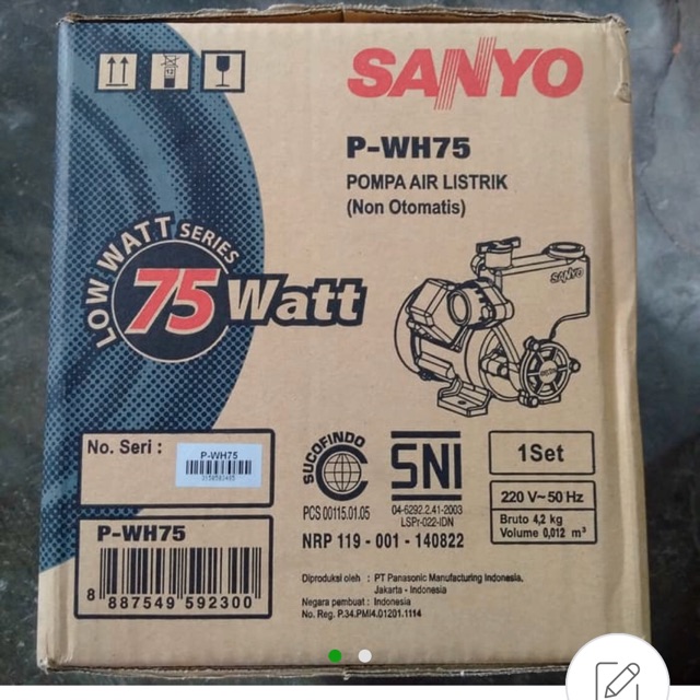 Pompa air sanyo juga tersedia untuk kebutuhan sumur dangkal ataupun sumur bor dalam dengan spesifikasi model dan harga yang sangat beragam menyesuaikan kebutuhan. Selanjutnya, pompa air merk sanyo yang satu dijual dengan harga 365 ribu rupiah, mesin ini menawarkan daya hisap maksimal 9 meter dengan daya dorong mencapai 20 meter. Pompa air ini dapat digunakan untuk kedalaman air hingga 9 meter namun mampu mendorong air hingga 30 meter. Lebih awet, mechanical seal : Pompa air sanyo 200 watt. Sanyo sendiri sebenarnya merk dari pompa air, namun karena telah terkenal cukup lama pompa air lain pun disebut sanyo. 25 liter/menit pada saat total head 9 meter, pressure tank : 9 meter, normal praktek kurang lebih 6 meter diukur dari permukaan air daya dorong maksimum: 175 watt ( p2 ), daya hisap : 75 watt daya hisap maksimum: Pompa air adalah sebuah alat yang memberikan manfaat besar sekali bagi kehidupan setiap manusia dalam kesehariannyanya. Pompa air sanyo 75 watt ini sangat berkualitas tinggi, sehingga memudahkan kita untuk menggunakan air secara mudah dan sangat membantu pemompaan air di sumur, torn dan lain sebagainya. Pompa air panasonic dikenal dengan daya sedotnya tinggi dan mesin pompa yang awet, termasuk untuk tipe panasonic gl 75jxk.